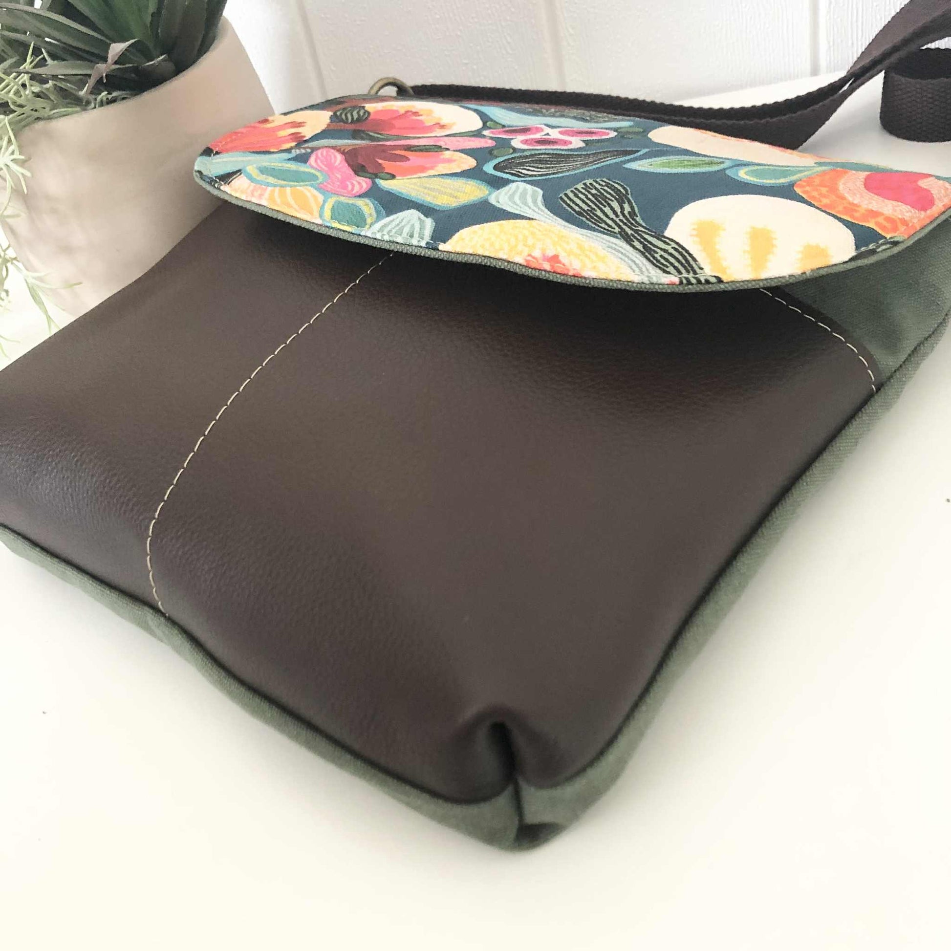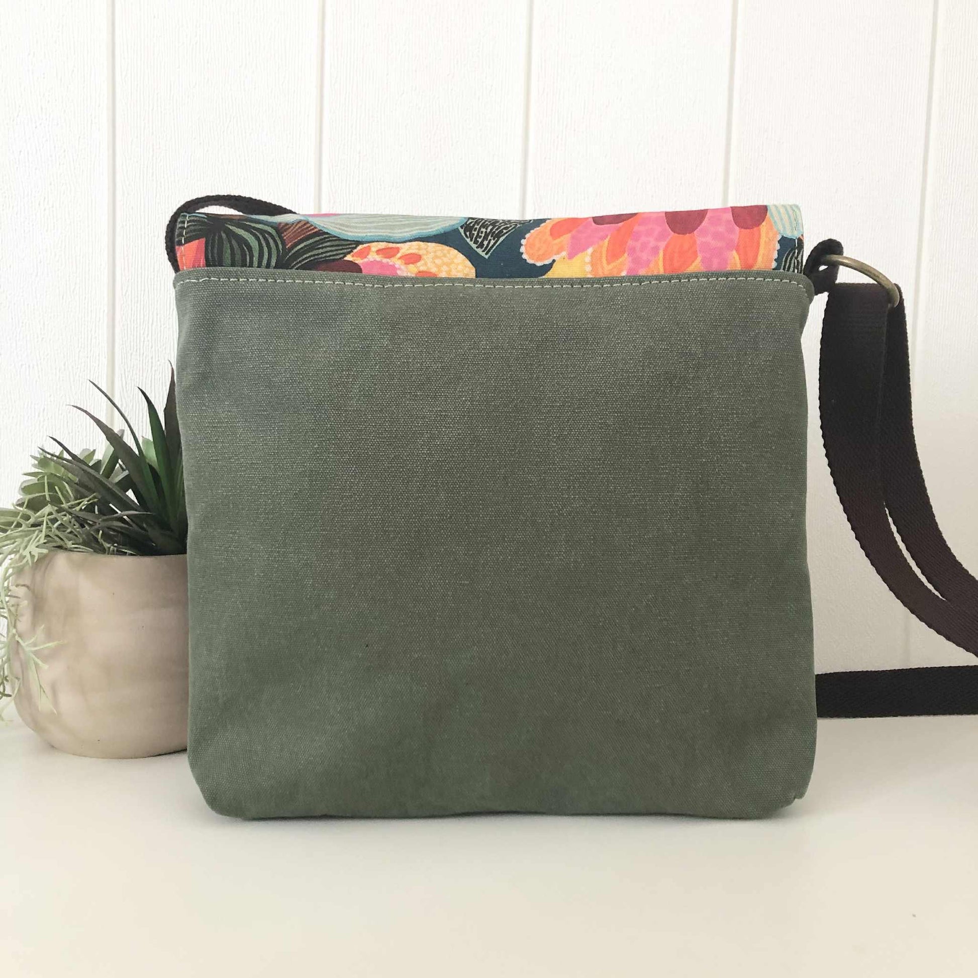 Cassinia Crossbody Bag - Green Canvas and Brown Leather with Bush Flora