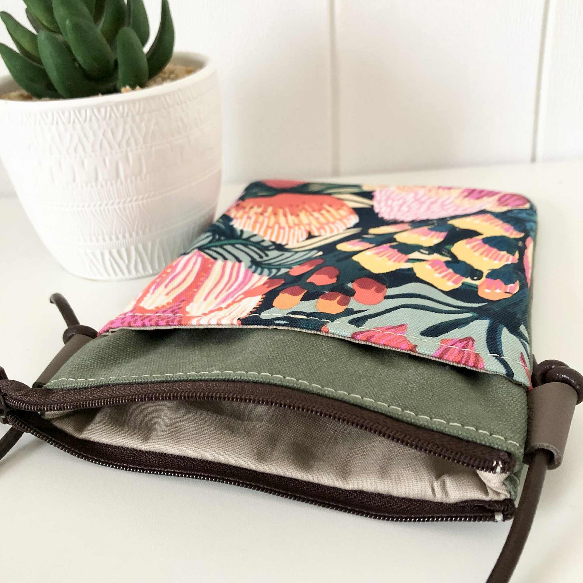 Lightweight and compact - the cross body phone sling has a main zippered section with an additional nature inspired fabric pocket on the front. Perfect for your phone plus a couple of other smaller items, just grab and go!